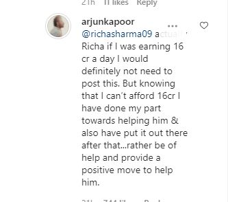 अर्जुनच्या या पोस्टवर त्याला ट्रोल करणाऱ्यांना अर्जुनने चांगल्याच शब्दात सुनावलंय. एक युजर अर्जुनला म्हणाला की “तुझी एका दिवसाची कमाई त्याला सहज वाचवू शकते.” यावर अर्जुन कपूरने या युजरला उत्तर दिलं आहे. ” खरं तर मी दिवसाला 16 कोटी रुपये कमवत असतो तर मला नक्कीच ही पोस्ट करण्याची गरज पडली नसती. पण मला माहितेय मला 16 कोटींची मदत करणं शक्य होणार नाही . म्हणून मी माझ्या परीने मदत केली आहे. माझा देणगी दिल्यानंतरच मी मदतीचं आवाहन केलं आहे. त्यापेक्षा मदत करा आणि त्याला मदत करण्यासाठी सकारात्मक हालचाल करा.” असं उत्तर देत अर्जुनने युजरची बोलती बंद केली आहे.