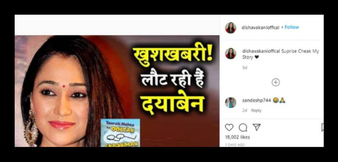 ‘तारक मेहता का उल्टा चष्मा’ या लोकप्रिय मालिकेतून नावारुपास आलेली अभिनेत्री दिशा वकानी उर्फ दया बेन मालिकेत पुन्हा कधी परतणार? हा प्रश्न चाहते सातत्याने विचारत आहेत. लग्नाच्या निमित्ताने मालिकेतून ब्रेक घेणारी दिशा अडिच वर्षानंतरही परतलेली नाही. नुकतेच ‘तारक मेहता’ मालिकेने ३००० भागांचा टप्पा ओलांडला. या निमित्ताने दिशाने आपल्या इन्स्टाग्राम अकाउंटवर मालिकेतील काही फोटो पोस्ट केले होते. हे फोटो पाहून काही चाहत्यांनी संताप व्यक्त केला आहे. असे फोटो दाखवून आमच्या भावनांशी खेळू नकोस? अशी सक्त ताकिद त्यांनी दिशाला दिली आहे.