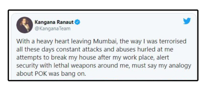 “मी अत्यंत जड अंत:करणानं मुंबईचा निरोप घेत आहे. माझी निंदा नालस्ती केली गेली, ऑफिसपाठोपाठ माझं घर तोडण्याचा प्रयत्न झाला. सुरक्षारक्षकांचा पहारा माझ्याभोवती ठेवावा लागला. ज्याप्रकारे मला दहशत दाखवण्यात आली ते बघता पाकव्याप्त काश्मीरची तुलना वर्मी लागली असंच म्हणावं लागेल.” मुंबई सोडताना कंगनाने अशा आशयाचं ट्विट केलं आहे. या ट्विटद्वारे तिने पुन्हा एकदा आपल्या टीकाकारांवर निशाणा साधला आहे. तिचं हे ट्विट सध्या सर्वांचेच लक्ष वेधून घेत आहे.