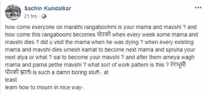 आपल्याला मिळालेले संस्कार, रंगभूमीवर नि:स्वार्थपणे काम करणारे विजूमामा यांच्याशी असलेलं नातं, त्यांचं अमूल्य योगदान या सर्व गोष्टींकडे जितेंद्रने लक्ष वेधलं. माझी मुलगी स्पृहा, सई, पर्ण यांना आपली मुलगी आतापासूनच आत्या/ मावशी म्हणून हाक मारते असं म्हणत ही बाब संस्कारांची आहे, हा मुद्दा जितेंद्रन निकषाने अधोरेखित केला. या पोस्टच्या शेवटी त्याने सचिन यांना आपण काल (शुक्रवारीच) उत्तर देणार असतो, असंही स्पष्ट केलं. मुख्य म्हणजे या पोस्टच्या शेवटी जितेंद्रचे शब्द तीक्ष्ण झाले असून, त्यातून कुंडलकरांवर थेट निशाणा साधला गेल्याचं कळत आहे.