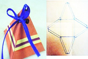 छायाचित्रात दाखविल्याप्रमाणे (कुठल्याही आवडीच्या रंगात) चौकोनी आकाराचा पाया ठेवून आकृती काढून घ्या. आकृती बाहेरील बाजूने कापा. त्रिकोणाच्या मार्जिन्स आतल्या बाजूस…