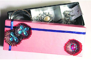 साहित्य : खणांचा (चॉकलेटचा) बॉक्स, ग्लिटर पेपर, सॅटिन पट्टी, चॉकलेटचे द्रोण, क्रिस्टल, कात्री, गम. कृती : जुन्या बॉक्सच्या झाकणाला ग्लिटर…