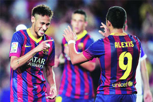 ब्राझीलचा नवा तारा नेयमार आणि नवे प्रशिक्षक गेराडरे मार्टिनो यांचे बार्सिलोनाच्या दणदणीत विजयामुळे संघात धडाक्यात पदार्पण साजरे झाले.