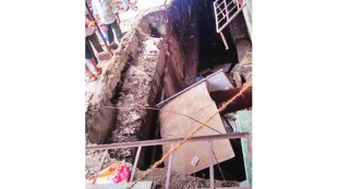 बदलापुरातील कात्रप भागात एका दुकानासमोरील भाग कोसळून तेथे असलेली टपरी खाली असलेल्या गटारात पडली.