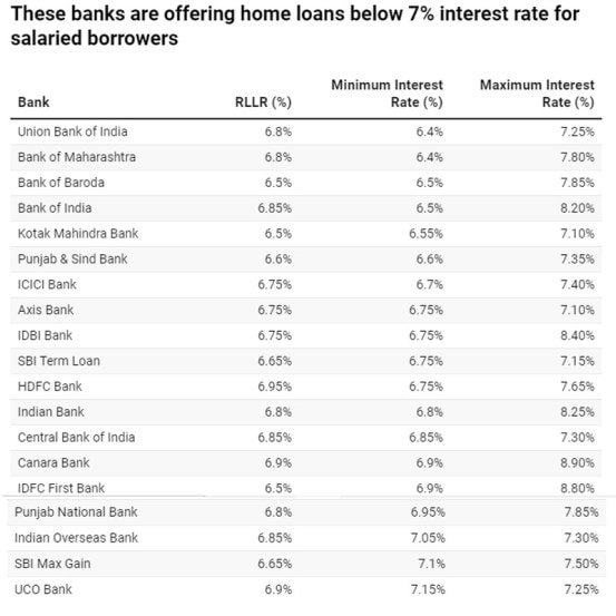 उदाहरणार्थ, युनियन बँक ऑफ इंडियाचे रेपो-रेट लिंक्ड होम लोन किमान ६.४% पासून सुरू होते. एसबीआय(SBI) टर्म लोन ६.६५% पासून सुरू होते आणि एचडीएफ (HDFC) बँकेचे गृहकर्ज ६.९५% पासून सुरू होते. बँक ऑफ महाराष्ट्र गृहकर्जावर ६.४०% पासून सुरू होणारा व्याजदर देत आहे. पगारदार कर्जदारांसाठी हे गृहकर्ज दर आहेत. खालील काही बँका कमी व्याजदर देतात ते जाणून घ्या.