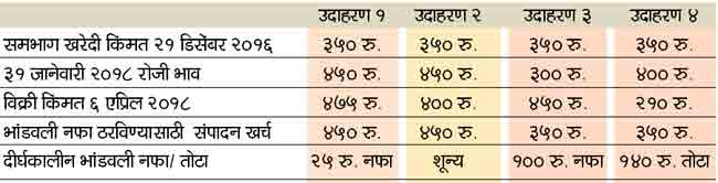 * उदाहरण ४ : समजा एखाद्या समभागाची खरेदी किंमत २१ डिसेंबर २०१६ला ३५० रुपये होती आणि ३१ जानेवारी २०१८ रोजी त्या समभागाचा कमाल बाजार भाव ४०० रुपये होता आणि हे समभाग ६ एप्रिल २०१८ रोजी तुम्ही २१० रुपयांना विकले तर त्या समभागाची विक्रीची किंमत ही खरेदीच्या किमतीपेक्षा १४० रुपयांनी कमी असल्याने दीर्घकालीन भांडवली नुकसान १४० रुपये(रुपये ३५० – २१०) धरले जाईल.