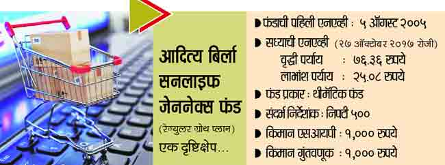 आदित्य बिर्ला सनलाइफ जेननेक्स फंड हा या बदलाच्या लाभार्थी ठरलेल्या कंपन्यांतून गुंतवणूक करणारा फंड आहे. झी एंटरटेनमेंट, आयनॉक्स लीझर, युनायटेड स्पिरीट्स, एलआयसी हौसिंग फायनान्स, बाटा इंडिया, रिलॅक्सो फुटवेअर आणि नव्याने सूचिबद्ध झालेली प्रताप स्नॅक्स या कंपन्या या बदलाची प्रतीके आहेत. या प्रतीकांचा वेध घेत आदित्य बिर्ला सन लाइफ जेननेक्स फंडाने या कंपन्यांत गुंतवणूक केली आहे. अनिल शहा हे या फंडाचे निधी व्यवस्थापक आहेत. २९ सप्टेंबर रोजीच्या विवरण पत्रकानुसार फंडाची ६५.८४ टक्के गुंतवणूक लार्ज कॅप, २२.६९ टक्के गुंतवणूक मिड कॅप तर ३.४६ टक्के स्मॉल कॅप आणि ८.०१ टक्के गुंतवणूक रोकडसंलग्न आहे. फंडाने गुंतवणुकीसाठी सर्वाधिक प्राथमिकता अनुक्रमे बँका, ग्राहकोपयोगी वस्तू, गैरबँकिंग वित्तीय कंपन्या, वाहन आणि वाहनपूरक उद्योग यांना दिली आहे. फंडाची सर्वाधिक गुंतवणूक एचडीएफसी बँक, मारुती सुझुकी, इंडसिंध बँक, आयशर मोटर्स, आयटीसी लिमिटेड या कंपन्यांत आहे. फंडाची पहिली एनएव्ही ५ ऑगस्ट २००५ रोजी जाहीर झाली. या फंडाच्या पहिल्या ‘रेग्युलर ग्रोथ एनएव्ही’ला एक लाखाच्या गुंतवणुकीचे २७ ऑक्टोबर २०१७च्या रेग्युलर ग्रोथ एनएव्हीनुसार ७.६७ लाख रुपये झाले असून परताव्याचा वार्षिक दर १८.०७ टक्के आहे. या फंडात पहिल्या दिवसासून पाच हजारांच्या नियोजनबद्ध ‘एसआयपी’च्या ७.३५ लाख गुंतवणुकीचे २४.३१ लाख रुपये झाले असून परताव्याचा वार्षिक दर १८.२८ टक्के आहे.