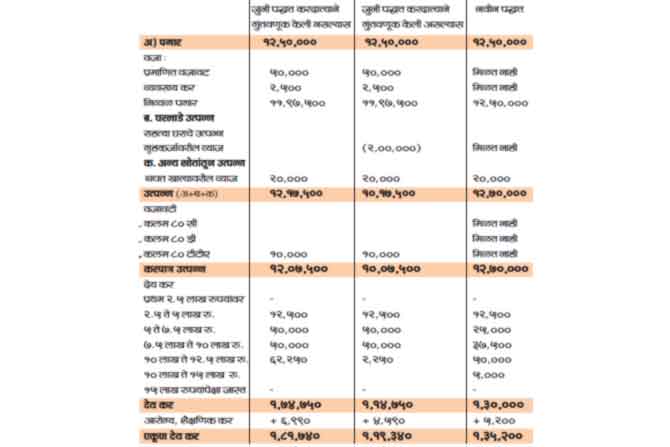 खालील उदाहरणात नवीन पद्धतीने आणि जुन्या पद्धतीने करदात्याने करबचतीची गुंतवणूक केलेली असल्यास आणि गुंतवणूक केलेली नसल्यास करदायित्व किती आहे हे तुलनात्मक तक्त्यात दर्शविले आहे :