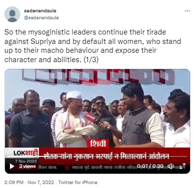 सुप्रिया सुळेंचे पती सदानंद सुळे यांच्या नावाने असलेल्या ट्वीटर हॅण्डलवरुन हा व्हिडीओ पोस्ट करण्यात आला आहे. “या महिलाविरोधी नेत्यांकडून सुप्रियाबद्दल आणि पर्यायाने सर्व महिलांबद्दल वादग्रस्त विधाने सुरुच आहे. पुरुषार्थ सांगणारे हे लोक त्यांच्या वर्तुवणुकीमुळे आणि क्षमतेमुळे उघडे पडले आहेत,” असं सदानंद सुळे यांच्या नावाने असलेल्या अकाऊंटवरुन ट्वीट करण्यात आलं आहे. हे अकाऊंट व्हेरिफाइड नाही.