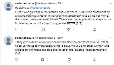 आधी स्वयंपाकघरात जा किंवा इतर कुठेतरी असं म्हटलं गेलं आणि आता कॅबिनेटमध्ये असलेल्या मंत्र्याने केलेलं हे विधान केलं आहे. ही लोक स्वत:ला लोकप्रतिनिधी म्हणतात आणि हे नव्या पुढारलेल्या सरकारचे नेते आहेत, असंही अन्य एका ट्वीटमध्ये म्हटलं आहे. “स्वत:बद्दल सोडून त्यांना इतरांबद्दल आणि महिलांबद्दल काहीही वाटत नाही. सुप्रिया चांगलं काम करत राहा. तुला अधिक शक्ती मिळो. अशा नेत्यांची विचारसणी उघडी पाडणारी महिलाच खरं नेतृत्व असते,” असंही सदानंद सुळेंच्या नावाने असलेल्या या खात्यावरुन केलेल्या तिसऱ्या ट्वीटमध्ये म्हटलंय.