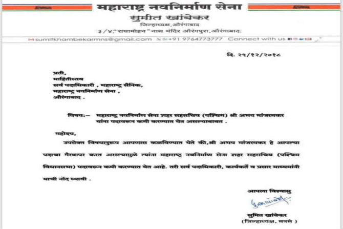 दरम्यान, मनसेचे मराठवाडा संपर्क प्रमुख राजीव पाटील २८ डिसेंबर रोजी शहरात आले असतांना खांबेकर यांनी घडलेला प्रकार पाटील यांना सांगितला. त्यानंतर मांजरमकर यांना पदावरुन काढून टाकल्याचे पत्र खांबेकर यांनी दिले. त्यामुळे चिडलेल्या मांजरमकर यांनी राज ठाकरे यांच्या नावाने सुसाईड नोट लिहीत रविवारी दुपारी ४ वाजता मनसे शहर प्रमुख बिपीन नाईक यांच्या कार्यालयासमोर फिनेल पिऊन आत्महत्येचा प्रयत्न केला. त्यापूर्वी त्यांनी व्हाॅटसअॅपवर आत्महत्या करत असल्याचे मेसेज पाठवले होते. दोन तास त्यांच्या मेसेजची दखल कोणीही घेतली नाही. शेवटी ४ वाजता मनसेचे गौतम आमराव यांनी मांजरमकरांना फोन केला. त्यावेळी त्यांनी फिनेल घेतले होते. त्यांना ताबडतोब उपचारासाठी खासगी रुग्णालयात दाखल करण्यात आले. त्यांची प्रकृती आता स्थिर आहे.