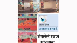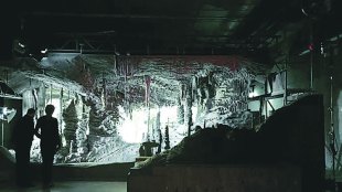ही चित्रं काश्मीबद्दल आहेत, आणि नाहीतसुद्धा. नाटकाच्या विंगांइतक्या मोठय़ा आकाराचे पडदे गॅलरीभर लावलेले