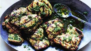 आता हे मुरवलेले चिकन मैद्यात घोळून दोन्ही बाजूंनी छान ग्रील करून घ्या.