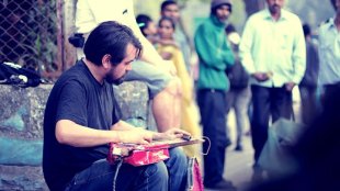 पाठीवर अॅकॉस्टिक गिटार, छोटा स्पिकर आणि हातात कपडे ठेवण्याची पेटी..