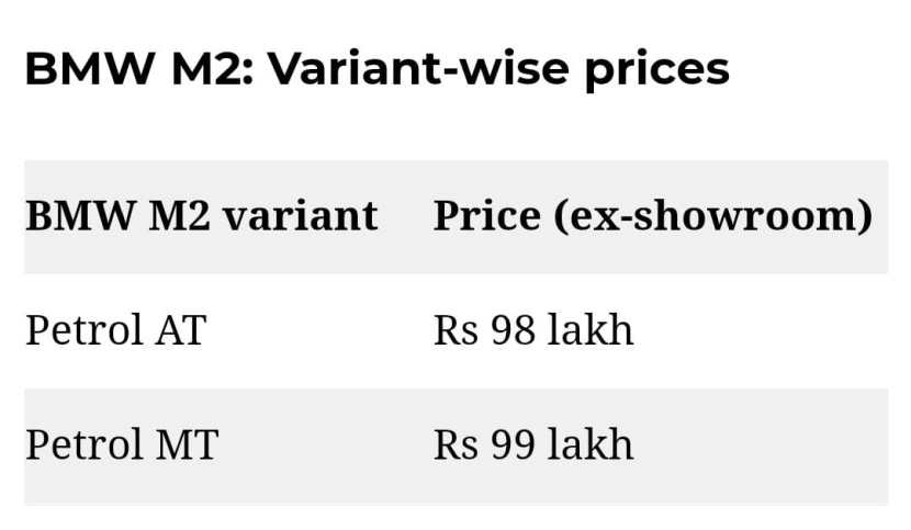 Financial Express ने दिलेल्या माहितीनुसार, ऑल-न्यू BMW M2 च्या पेट्रोल ऑटोमॅटिक व्हेरिएंटची एक्स शोरुममधील किंमत ९८ लाख रुपयांपासून सुरु होते. तसेच अधिकचे १ लाख रुपये भरुन कोणीही ऑपशनल मॅन्युअल ट्रान्समिशन व्हेरिएंटची मालकी मिळवू शकणार आहे. असे केल्याने कारची किंमत ९९ लाख रुपये इतकी होईल. BMW M2 ही कार भारतामध्ये CBU (completely built unit) म्हणून आयात केली जाते.