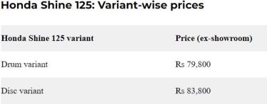 कंपनीने होंडा शाईन १२५ बाईक ७९,८०० (एक्स-शोरूम, दिल्ली) रुपयांमध्ये लॉन्च केली आहे.