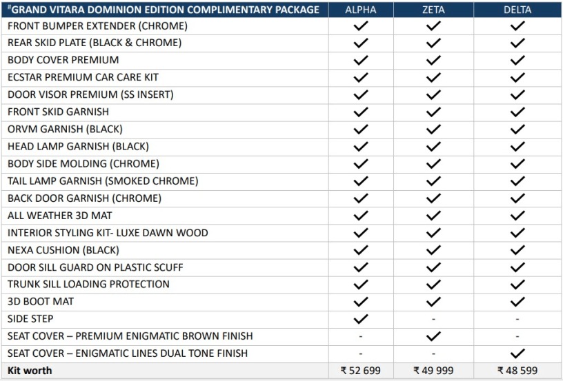 मारुती सुझुकी ग्रँड विटारा डोमिनियन एडिशनमधील अल्फा व्हेरिएंटच्या कॉम्प्लिमेंटरी पॅकेजची किंमत ५२,६९९ रुपये इतकी आहे. ग्रँड विटाराच्या अल्फा व्हेरिएंटमध्ये क्रोम्ड फ्रंट बंपर एक्स्टेंडर,ब्लॅक आणि क्रोम रिअर स्किड प्लेट, प्रीमियम बॉडी कव्हर, कार केअर किट, प्रीमियम डोअर वायजर, फ्रंट स्किड गार्निश,ब्लॅक गार्निशसह आउटसाइड रिअर व्ह्यू मिरर, ब्लॅक गार्निश केलेले हेडलॅम्प, क्रोम बॉडी साइड मोल्डिंग, स्मोक्ड क्रोम गार्निश टेललॅम्प, क्रोम बॅक डोअर गार्निश, ऑल वेदर 3डी मॅट्स, इंटिरियर स्टाइलिंग किट, ब्लॅक नेक्सा कुशन्स, डोअर सील गार्ड, ट्रंक सील लोडिंग प्रोटेक्शन आणि 3D बूट मॅट आणि साइड स्टेप्स सारखे फिचर्स आहेत.