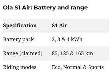 Ola S1 Air मध्ये 2, 3 आणि 4 kWh बॅटरी पॅकचा समावेश करण्यात आला आहे. एकदा चार्ज केल्यावर ही गाडी अनुक्रमे ८५, १२५ आणि १६५ किमी रायडिंग रेज देतील असा दावा कंपनीने केला आहे. या स्कूटरमध्ये इको, नॉर्मल आणि स्पोर्ट्स असे तीन रायडिंग मोड आहेत.