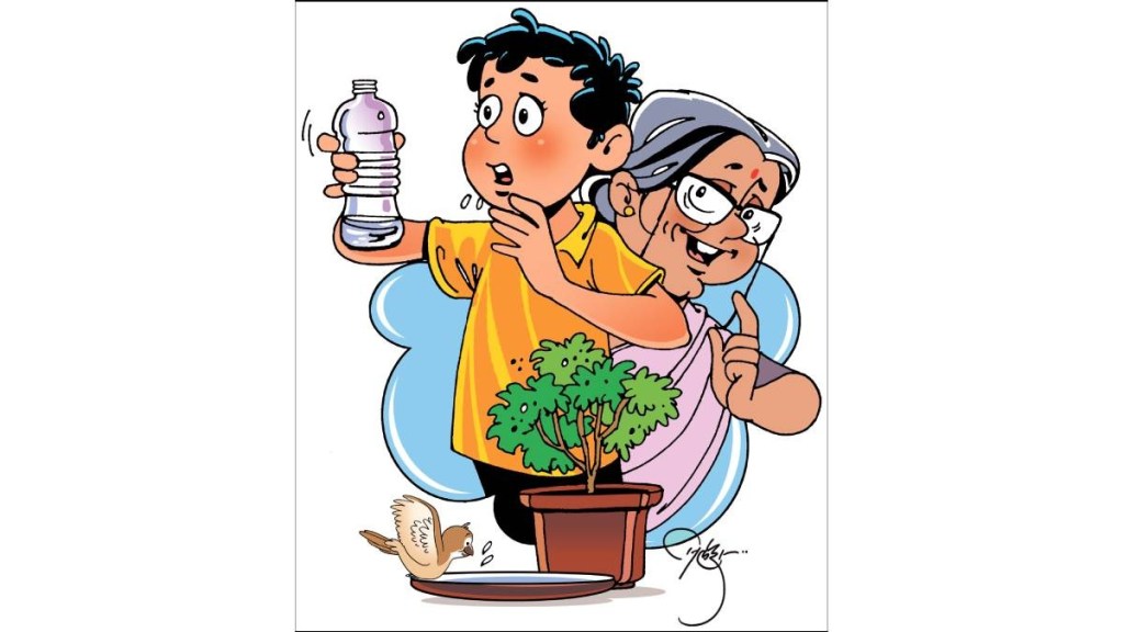 ‘‘रोहन पाण्याची बाटली ठेव तुझ्याजवळ. पुन्हा लागेल तुला.’’ चुळबुळ्या रोहनला बाटली सांभाळायची नव्हती. त्यानं बाटलीतील पाणी ओतून टाकण्याचा खेळ केला आणि बाटली फेकून दिली. शांतपणे बसून राहिलेल्या आजीच्या नजरेतून ही गोष्ट सुटली नाही. त्या वेळी ती काही बोलली नाही इतकंच. दोन-चार दिवसांनी शाळेतून आल्यावर आजी आणि रोहनच्या गप्पा रंगात आल्या होत्या.