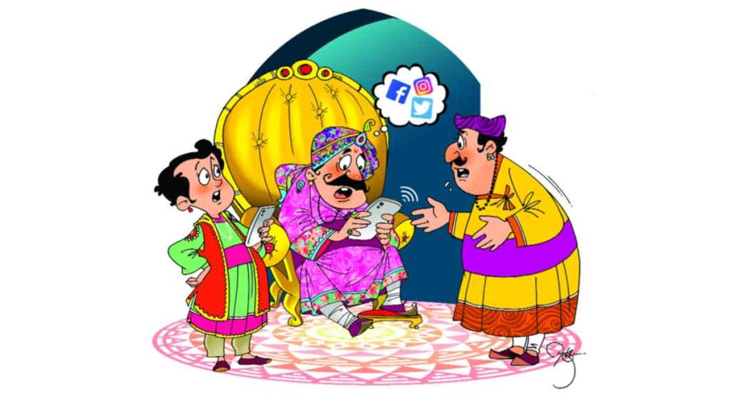 ‘‘महाराज, सेनापती आणि त्यांचे काही विश्वासातले सैनिक मिळून अनेक ‘फेक’ नावांनी सोशल मीडियावर तुमची मानहानी करण्याच्या इराद्याने मोहीम राबवताहेत. प्रजेमध्ये असंतोष निर्माण करून तुमची सत्ता उलथवून लावण्याचा त्यांचा मानस होता.’’