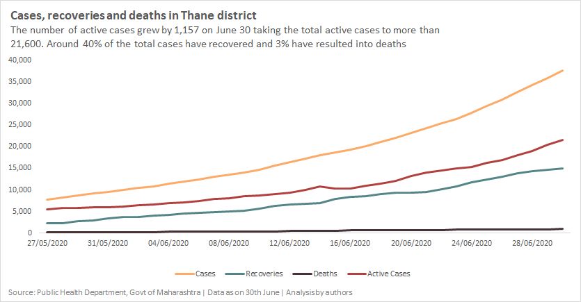 मागच्या आठवड्यात एक दिवस सोडला तर दररोज होणाऱ्या कोविड -१९ च्या रुग्णांमधील वाढ एकट्या ठाणे जिल्ह्यात तुलनात्मकरीत्या मुंबईहुन अधिक आहे. २०११ च्या जनगणना आलेखानुसार ठाण्याची लोकसंख्या १.११ कोटी तर, मुंबईची लोकसंख्या हि १.२४ कोटी आहे तरी ठाणे जिल्यातिल रुग्णांची वाढ ३० जूनला मुंबईतील वाढीच्या जवळजवळ दुप्पट होती. २६ मे ते ५ जून ह्या १० दिवसांमध्ये कोविड-१९ चे रुग्ण ४५०० ने वाढले.