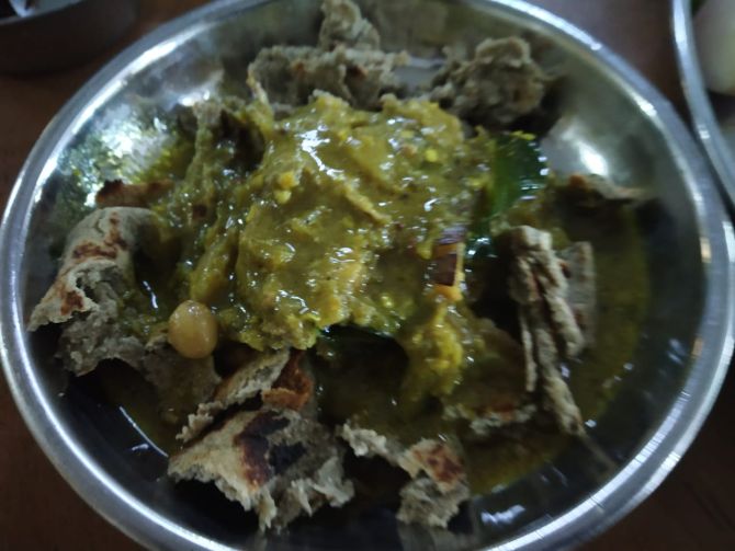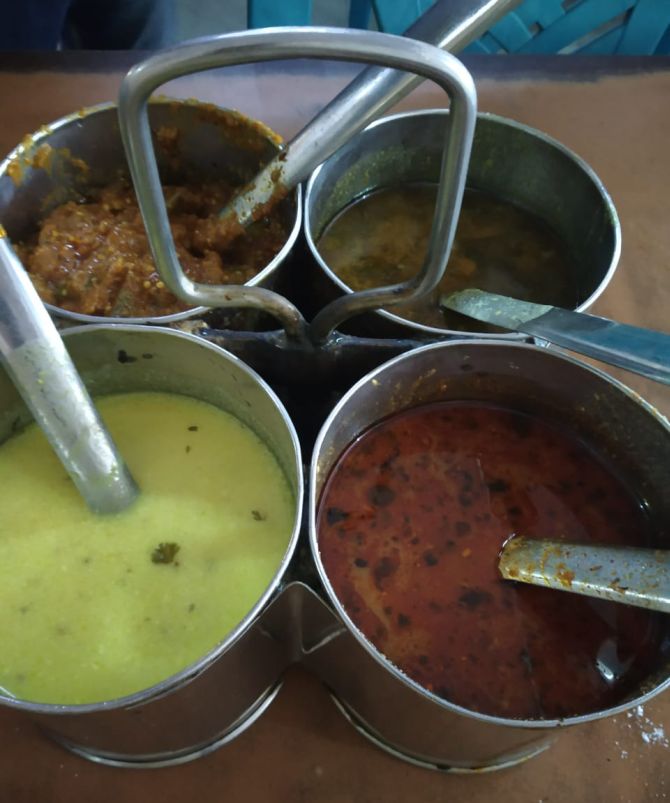 मेन्यूचा भला मोठा बोर्डच होता, काय खावं यांच्या विचारात असताना मालक मुलानेच सांगितले, मिक्स थाळी घ्या. सर्व पदार्थ येतील. मग एक रिकामी थाळी आणि 3 वाट्या आल्या. भाजी, कढी वगैरेचे चार खणी पात्र आणून ठेवले. कांदा, काकडी, लिंबू, पापड पण आणले. आता आपल्याला हवं तसं हवं तेवढं वाढून घायचं. चपाती, पराठा, ज्वारीची आणि कळणाची भाकरी, मी कळणाची भाकरी घेतली. वांग्याची भाजी कम भरीत आणि मेथी-मिरचीच्या पातळ भाजी सोबत खाऊ लागलो. मर्यादित तिखट पण एकदम चमचमीत प्रकार होता.