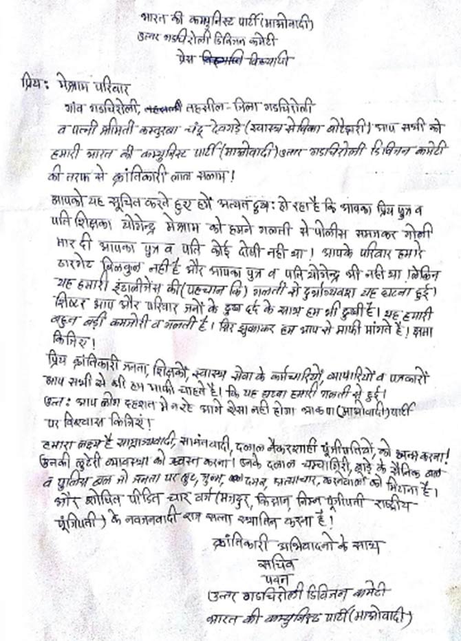 मेश्राम यांच्या हत्येचा स्थानिक शिक्षक संघटनेने निषेध केला.१८ मार्च रोजी त्यांच्या शाळेतील शिक्षक, विद्यार्थ्यांनी “आमचे स्व. युगेंद्र मेश्राम सर यांची काय चूक?” असे फलक हाती धरून गडचिरोली शहरातुन मूक रॅली काढून माओवाद्यांचा निषेध केला. यानंतर प्रतिबंधित माओवादी संघटनेने माफीनामा प्रसिद्ध केला. यामध्ये माओवाद्यांनी युगेंद्र मेश्रामला पोलीस असल्याचे समजून चुकून मारल्याचे कबूल केले आहे. “हमारी इंटलीजेंस की (पहचान कि) गलती से दुर्भाग्यवश यह घटना हुई…”, असे म्हणून माओवाद्यांनी मेश्राम कुटुंबाची माफी मागितली आहे. माओवाद्यांचा माफीनामा खरा मानला तरी त्याने मेश्राम व त्यांच्या कुटुंबाला न्याय मिळेल का? या माफीनाम्याने ना गेलेला जीव परत येणार ना मारेकर्यांना शिक्षा होणार. त्यामुळे माओवाद्यांच्या या माफीनाम्याला काहीही अर्थ नाही.