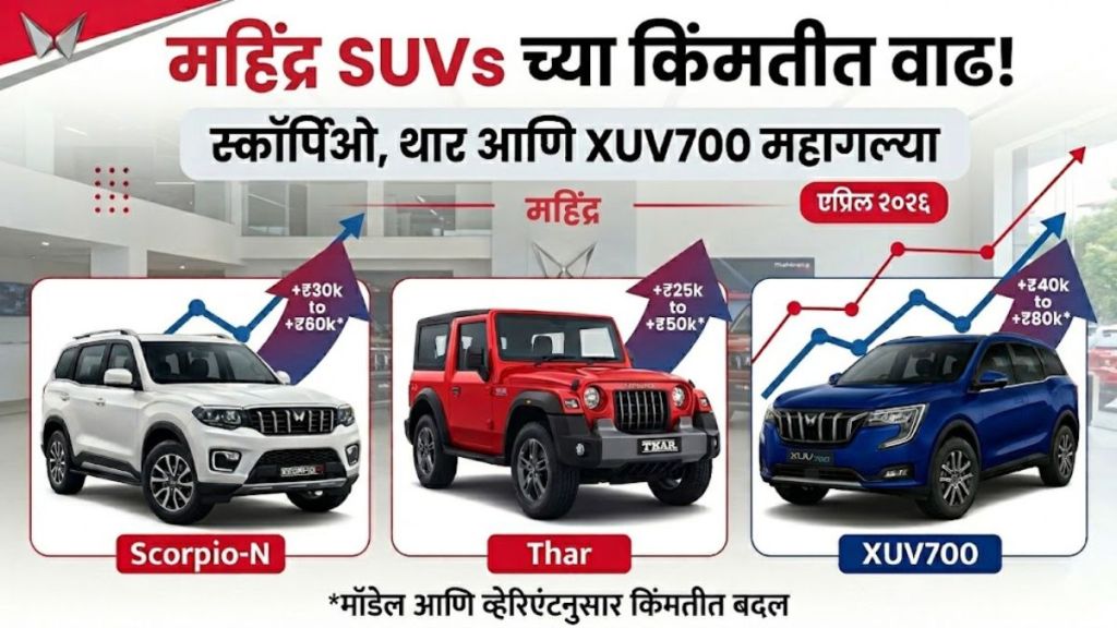 рдЖрдШрд╛рдбреАрдЪреА рд╡рд╛рд╣рди рдирд┐рд░реНрдорд┐рддреА рдХрдВрдкрдиреА рдЕрд╕рд▓реЗрд▓реНрдпрд╛ рдорд╣рд┐рдВрджреНрд░рд╛ рдЕрдБрдб рдорд╣рд┐рдВрджреНрд░рдиреЗ рд╡рд╛рд╣рдирд╛рдВрдЪреНрдпрд╛ рдХрд┐рдорддреА рд╡рд╛рдврд╡рдгреНрдпрд╛рдЪреА рдШреЛрд╖рдгрд╛ рдХреЗрд▓реА. рдХрдВрдкрдиреАрдиреЗ рдиреЙрди-рдЗрд▓реЗрдХреНрдЯреНрд░рд┐рдХ SUV (рд╕реНрдкреЛрд░реНрдЯреНрд╕ рдпреБрдЯрд┐рд▓рд┐рдЯреА рд╡реНрд╣реЗрдЗрдХрд▓реНрд╕) рдЖрдгрд┐ рд╡реНрдпрд╛рд╡рд╕рд╛рдпрд┐рдХ рд╡рд╛рд╣рдирд╛рдВрдЪреНрдпрд╛ рдХрд┐рдорддреАрдд реи.рел рдЯрдХреНрдХреНрдпрд╛рдВрдкрд░реНрдпрдВрдд рд╡рд╛рдврд╡рдгреНрдпрд╛рдЪрд╛ рдирд┐рд░реНрдгрдп рдШреЗрддрд▓рд╛ рдЖрд╣реЗ. рдпреЗрддреНрдпрд╛ рем рдПрдкреНрд░рд┐рд▓рдкрд╛рд╕реВрди рд╣реА рд╡рд╛рдв рд▓рд╛рдЧреВ рд╣реЛрдгрд╛рд░ рдЖрд╣реЗ.