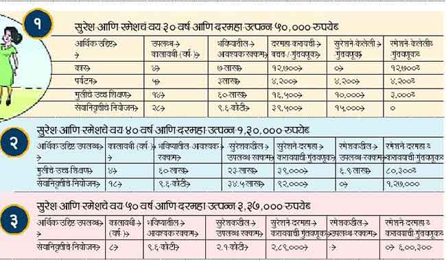 सुरेशने जीवनशैलीवरील खर्च मर्यादित ठेवून दरमहा भविष्यासाठी २५,००० रुपयांची गुंतवणूक केली. रमेशने मात्र जीवनशैलीवर जास्त खर्च करून केवळ ३,००० रुपयांची गुंतवणूक केली. दरवर्षी दोघांचाही पगार वाढत होता आणि सुरेश जीवनाचा आनंद घेताना भविष्यासाठी गुंतवणूक करण्यावर भर देत असे. रमेश मात्र नवनवीन महागडे मोबाइल, कार यासारख्या जीवनशैलीवरील खर्च अधिक करून माफक प्रमाणात गुंतवणूक करत असे. वयाच्या ४० व्या वर्षी सुरेश आणि रमेश यांची आर्थिक स्थिती जाणून घेऊ या. दरवर्षी १० टक्के पगारवाढ मिळाल्यामुळे वाढीव पगार १,३०,००० रुपये. दोघांनीही दरम्यानच्या काळात नियमित गुंतवणूक केल्यानंतर विविध उद्दिष्टांसाठी उपलब्ध असलेली रक्कम खालीलप्रमाणे: