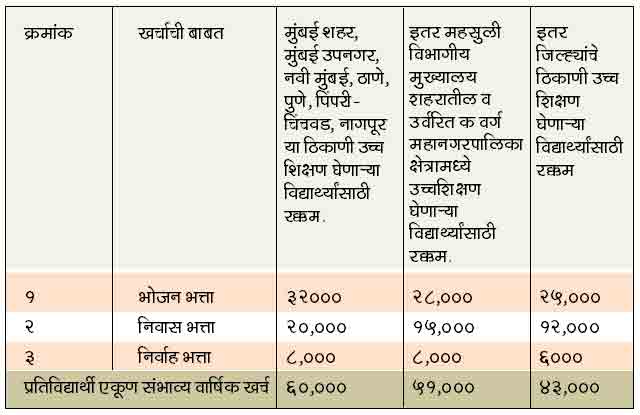 वरील रकमेव्यतिरिक्त वैद्यकीय व अभियांत्रिकी शाखेतील विद्यार्थ्यांसाठी प्रतिवर्ष रु. ५०००/- व अन्य शाखेतील विद्यार्थ्यांना प्रतिवर्षी रु. २०००/- इतकी रक्कम शैक्षणिक साहित्यासाठी ठोक स्वरूपात देण्यात येईल.