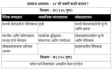 सामान्य अध्ययन – IV ची तयारी कशी कराल? हा अभ्यासक्रम दर्शविणारा सोबतचा तक्ता पाहिल्यास विद्यार्थ्यांच्या असे लक्षात येईल की, सामान्य अध्ययन – ४ या विषयाचा अभ्यासक्रम हा फक्त नैतिक तत्त्वज्ञान म्हणजेच इथिक्स या विषयापुरता मर्यादित नाही. तर त्यामध्ये सामाजिक मानसशास्त्र आणि लोक प्रशासन अशाही घटकांचा समावेश होतो. म्हणजेच हा पेपर आंतरविद्याशाखीय आहे आणि प्रत्येक शाखेची एखाद्या घटनेकडे वा मानवी वर्तनाकडे बघण्याची आपापली पद्धत आहे. हे लक्षात ठेवूनच या विषयांची तयारी करावी.