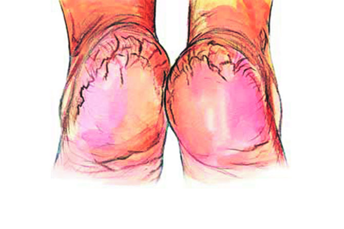 त्यांना सर्वप्रथम अनावश्यक ए.सी. बंद करायला सांगितला. ए.सी.मुळे शरीरातील घर्मरंध्रे बंद होतात व शरीरातील पाणी स्वेदावाटे बाहेर न गेल्याने त्वचेची रूक्षता अधिकच वाढते. मग या रूक्षतेमुळे पायांच्या भेगादेखील वाढतात. म्हणून यावर सोपा उपाय म्हणजे दिवसातून एकदा तरी दरदरून घाम आला पाहिजे असे व्यायाम अथवा एखादे काम करणे. तसेच सायंकाळी चार-पाच लिटर मिठाचे कोमट पाणी करून त्यात १५ मिनिटं दोन्ही पाय भिजत ठेवावेत. मग स्वच्छ पुसून घेऊन त्यावर आमसुलाचे तेल, राळेचं मलम अथवा घरातील देशी गायीचे शुद्ध तूप काशाच्या वाटीने घासून लावावे. या पायांच्या भेगांमध्ये कधी कधी चिखल्या नावाचा आजारपण दडलेला असतो. तो पाण्याच्या सहवासात जास्त काम केल्याने होतो. त्यासाठी वैद्याच्या सल्ल्याने निदान करून ‘व्रणरोपक तेल’ रोज रात्री लावावे. याने चिखल्या बऱ्या होतात. काही जणांना ‘प्लांटर सोरीअसीस’मुळे पायांना भेगा पडतात. या मध्ये तळव्यांना खाज जास्त सुटते, खपल्या निघू लागतात, रूक्षता वाढते, लाली वाढते, क्वचित रक्तस्रावही होतो. अशा वेळी करंज तेल पायांना चोळून लावावे व कण्हेरीची १० पाने तोडून आणून त्यांच्या वाफेने शेकावे.