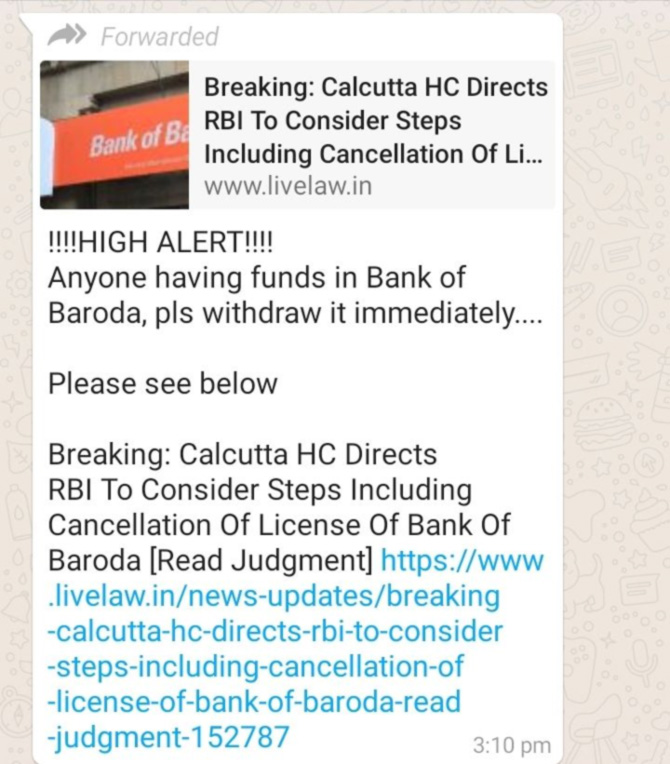 ‘बँक ऑफ बडोदा’चा (बॉब) परवाना रद्द करण्यात आला आहे. त्यामुळे ज्यांची खाती या बँकेत असतील त्यांनी ताबडतोब पैसे काढून घ्यावेत, असा संदेश व्हॉट्सअॅपवर दोन दिवसांपासून फिरत आहे. यासाठी कोलकाता न्यायालयाने मध्यंतरी दिलेल्या निर्देशांचा आधार घेण्यात आला आहे.