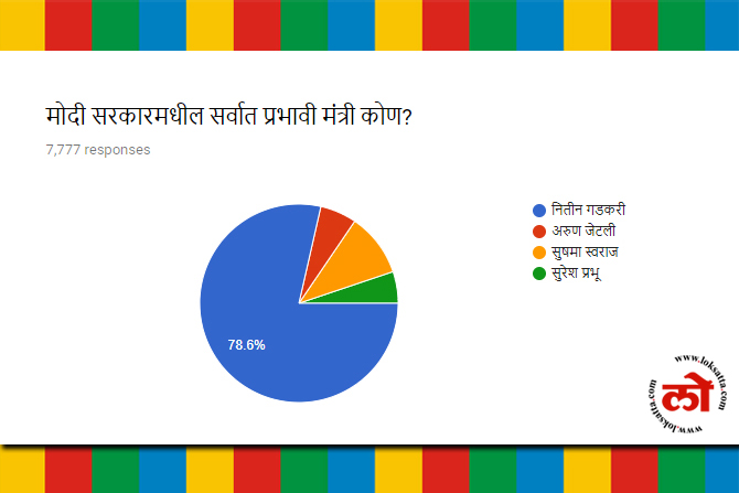 тАШрдореЛрджреА рд╕рд░рдХрд╛рд░рдордзреАрд▓ рд╕рд░реНрд╡рд╛рдд рдкреНрд░рднрд╛рд╡реА рдордВрддреНрд░реА рдХреЛрдг?, рдЕрд╕рд╛ рдкреНрд░рд╢реНрди рдпрд╛ рд╕рд░реНрд╡реЗрдХреНрд╖рдгрд╛рдордзреНрдпреЗ рд╡рд╛рдЪрдХрд╛рдВрдирд╛ рд╡рд┐рдЪрд╛рд░рдгреНрдпрд╛рдд рдЖрд▓рд╛. рдпрд╛ рдкреНрд░рд╢реНрдирд╛рд▓рд╛ рдирд┐рддреАрди рдЧрдбрдХрд░реА, рдЕрд░реБрдг рдЬреЗрдЯрд▓реА,рд╕реБрд╖рдорд╛ рд╕реНрд╡рд░рд╛рдЬ рдЖрдгрд┐ рд╕реБрд░реЗрд╢ рдкреНрд░рднреВ рдЕрд╕реЗ рдЪрд╛рд░ рдкрд░реНрдпрд╛рдп рджреЗрдгреНрдпрд╛рдд рдЖрд▓реЗ рд╣реЛрддреЗ. рдпрд╛рдкреИрдХреА рем рд╣рдЬрд╛рд░ резрежреп рд╡рд╛рдЪрдХрд╛рдВрдиреА рдирд┐рддреАрди рдЧрдбрдХрд░реА рд╣реЗ рд╕рд░реНрд╡рд╛рдд рдкреНрд░рднрд╛рд╡реА рдордВрддреНрд░реА рдЕрд╕рд▓реНрдпрд╛рдЪреЗ рдордд рдиреЛрдВрджрд╡рд▓реЗ. рд╣реА рдЖрдХрдбреЗрд╡рд╛рд░реА рдордд рдорд╛рдВрдбрдгрд╛рд▒реНрдпрд╛ рдПрдХреВрдг рд╡рд╛рдЪрдХ рд╕рдВрдЦреНрдпреЗрдЪреНрдпрд╛ ренрео.рем рдЯрдХреНрдХреЗ рдЗрддрдХреА рдЖрд╣реЗ. рд╡рд╛рдЪрдХрд╛рдВрдиреА рдЧрдбрдХрд░реАрдВрдирд╛ рджрд┐рд▓реЗрд▓рд╛ рд╣рд╛ рдХреМрд▓ рдореНрд╣рдгрдЬреЗ рд░рд╕реНрддреЗ рдмрд╛рдВрдзрдгреАрдЪрд╛ рд╡реЗрдЧ, рд░рд╕реНрддреЗ рдмрд╛рдВрдзрдгреАрд╕рдВрджрд░реНрднрд╛рдд рдХрд░рдгреНрдпрд╛рдд рдпреЗрдгрд╛рд░реЗ рд╡реЗрдЧрд╡реЗрдЧрд│реЗ рдкреНрд░рдпреЛрдЧ, рд╕реНрд╡рдЪреНрдЫ рдкреНрд░рддрд┐рдорд╛, рд╡реЗрд│реЛрд╡реЗрд│реА рд╡реЗрдЧрд╡реЗрдЧрд│реНрдпрд╛ рдХрд╛рд░реНрдпрдХреНрд░рдорд╛рдВрдордзреВрди рд╕рд░рдХрд╛рд░рдЪреА рднреВрдорд┐рдХрд╛ рд╕рдорд╛рдиреНрдпрд╛рдВрдкрд░реНрдпрдВрдд рдкреЛрд╣рдЪрд╡рдгреНрдпрд╛рдЪрд╛ рдЧрдбрдХрд░реАрдВрдЪрд╛ рдкреНрд░рдпрддреНрди рдпрд╛ рд╕рд░реНрд╡рд╛рдВрдЪрд╛ рд╣рд╛ рдкрд░рд┐рдгрд╛рдо рдЕрд╕рд▓реНрдпрд╛рдЪреЗ рдореНрд╣рдгрддрд╛ рдпреЗрдИрд▓.