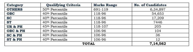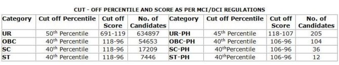 – जात प्रमाणपत्र - NEET परिक्षेला बसलेल्या १३,२६,७२५ उमेदवारांपैकी ७ लाखांपेक्षा अधिक उमेदवार ही परिक्षा पास झाले आहेत. या पास झालेल्या उमेदवारांपैकी ६.३ लाख उमेदवार सर्वसाधारण प्रवर्गातील आहेत.