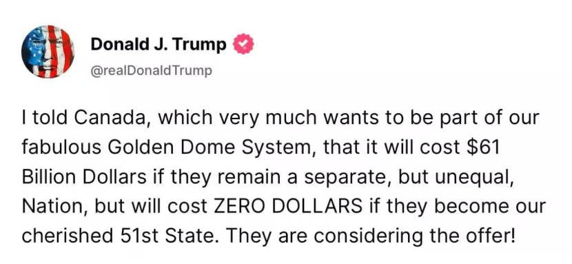 “आमच्या शानदार गोल्डन डोम सिस्टीमचा भाग होऊ इच्छिणाऱ्या कॅनडाला मी सांगितले की यांना ६१ अब्ज डॉलर्स खर्च येईल, परंतु जर ते आमच्या देशातील राज्य बनले तर त्यांना शून्य डॉलर्स खर्च येईल”, ट्रम्प यांनी मंगळवारी एका सोशल मीडिया पोस्टमध्ये लिहिले.