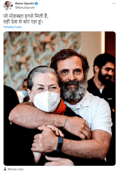 राहुल गांधींनी शेअर केलेल्या फोटोमध्ये सोनिया गांधी मास्क घालून उभ्या असल्याचं दिसत आहे. सोनिया गांधींच्या मागे उभ्या असलेल्या राहुल यांनी आपल्या आईच्या गळ्यात घात घालून खांद्यावर अनुवटी टेकवत हसतानाचा हा फोटो आहे. जे प्रेम आईकडून मिळतं तेच देशामध्ये वाटत आहे, अशा अर्थाच्या कॅप्शनसहीत राहुल गांधींनी हा फोटो शेअर केला आहे. “जो मोहब्बत इनसे मिली है, वही देश से बांट रहा हूं।” अशी हिंदीमध्ये कॅप्शन या फोटोला दिली आहे.