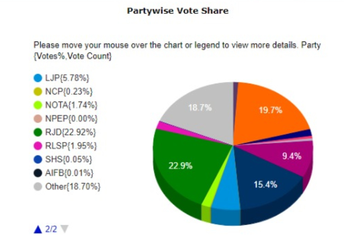 भारतीय निवडणूक आयोगाच्या वेबसाईटवरील आकडेवरीनुसार दुपारीपर्यंत झालेल्या मतमोजणीमध्ये भाजपाला सर्वाधिक म्हणजेच २२ टक्क्यांहून अधिक मत राष्ट्रीय जनता दल पक्षाला मिळाली आहेत. त्याचबरोबरच १९ टक्क्यांहून अधिक मत भाजपाला मिळाली आहेत. त्या खाळोकाल जेडीयू १५ टक्के आणि काँग्रेसला ९ टक्क्यांहून अधिक मतं मिळाली आहेत. विशेष म्हणजे बिहारमध्ये निवडणूक लढवणाऱ्या शिवसेनेला ०.०५ टक्के मत मिळाली आहे. अनेक ठिकाणी शिवसेनेच्या उमेदवारांचे डिपॉझीट जप्त झालं आहे. आश्चर्याची बाब म्हणजे शिवसेनेपेक्षा नोटाला अधिक १.७४ टक्के मतं मिळाली आहेत. महाराष्ट्रामध्ये काँग्रेस आणि शिवसेनेला एकत्र आणत महाविकास आघाडीची मोट बांधणाऱ्या राष्ट्रवादीलाही बिहारमध्ये फरसे यश मिळालेले नाही. राष्ट्रवादीला ०.२३ टक्के मतं मिळाली आहेत.