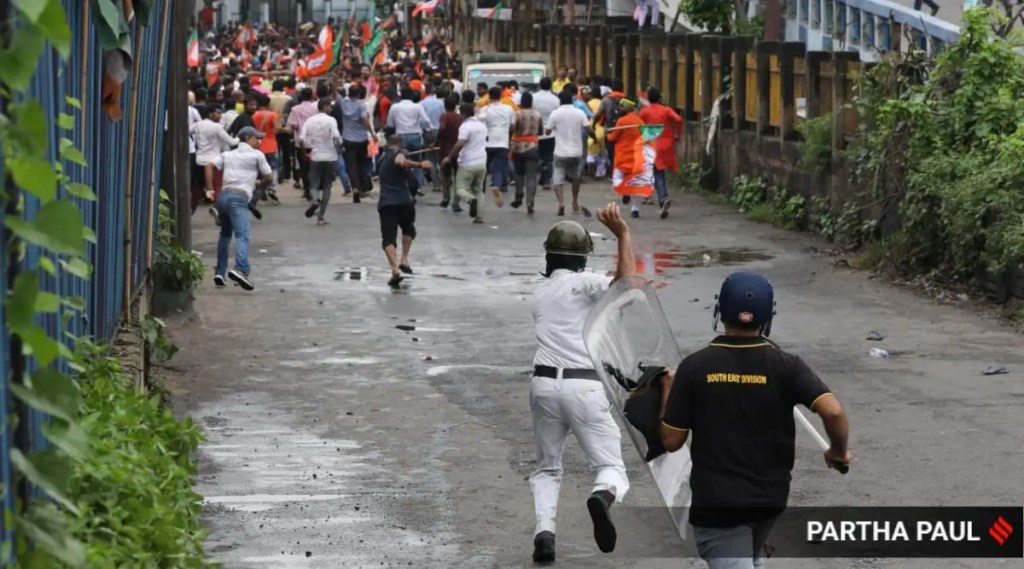 पश्चिम बंगालमधील ममता बॅनर्जी सरकारमधील भ्रष्टाचाराविरोधात भाजपाने ‘चलो नबन्ना’ मोर्चाचं आयोजन केलं आहे. या मोर्चात सहभागी होण्यासाठी भाजपाने कार्यकर्त्यांना कोलकात्यात येण्याचं आवाहन केलेलं. त्यासाठी भाजपाचे कार्यकर्ते राणीगंज रेल्वे स्थानकाकडे निघाले होते. पण, मोर्चाला परवानगी नसल्याने पोलीस आणि कार्यकर्त्यांमध्ये झटापट झाली.