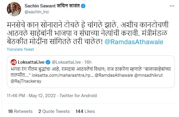 “भगवा रंग गौतम बुद्धांचा आहे. बुद्ध आणि भगवा रंग शांततेचा आहे. राज ठाकरे हे शिवसेना प्रमुख बाळासाहेब ठाकरे यांच्या तालमीत तयार झालेले असल्याने वाद करण्यापेक्षा वाद मिटविण्याचे काम करावे. अंगावर भगवा घेतल्यावर वाद नको,” असंही ते म्हणाले आहे. याच मुद्द्यावरुन महाराष्ट्र काँग्रेसचे नेते सचिन सावंत यांनी ट्विटरवरुन प्रतिक्रिया देताना आठवलेंना एक सल्ला दिलाय.