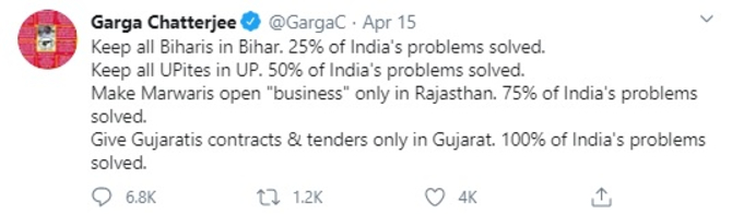 “बिहारमधील लोकांना बिहारमध्येच ठेवल्यास देशातील २५ टक्के समस्या सुटतील. तसेच उत्तर प्रदेशमधील लोकांना उत्तर प्रदेशमध्येच ठेवल्यास देशातील ५० टक्के अडचणी संपतील. मारवाडी व्यापाऱ्यांना राजस्थानमध्येच ठेवलं तर ७५ टक्के समस्यांचे सुटतील आणि गुजरातमधील लोकांना टेंडर आणि कंत्राट गुजरातमध्येच देण्यात आलं तर देशाच्या १०० टक्के समस्या सुटतील,” असं ट्विट गर्ग यांनी केलं होतं. करोनाचा प्रादुर्भाव रोखण्यासाठी देशभरामध्ये लॉकडाउनची घोषणा करण्यात आल्यानंतर हजारो कामगार आपल्या राज्यांमध्ये पायी चालत निघाल्याचे चित्र दिसून आले. याच पार्श्वभूमीवर गर्ग यांनी हे ट्विट केलं आहे.