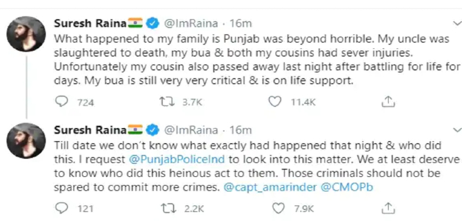 पंजाबमध्ये माझ्या कुटुंबाबरोबर घडलेली घटना भयंकर आहे. हल्लेखोरांनी केलेल्या हल्ल्यात माझ्या काकांचा जागीच मृत्यू झाला तर माझ्या आत्याला आणि चुलत भावाला गंभीर दुखापत झाली आहे. उपचारादरम्यान काल रात्री माझ्या भावाचा दुर्देवी मृत्यू झाला आहे. माझ्या आत्याची प्रकृती चिंताजनक असून तिला व्हेंटिलेटरवर ठेवण्यात आलं आहे, असं रैनाने ट्विट करुन म्हटलं आहे.