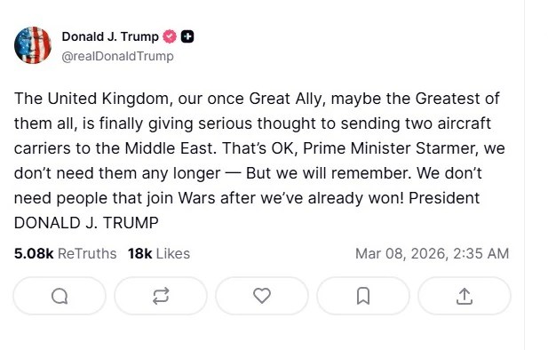 “युनायटेड किंग्डम, जो आपला एकेकाळी महान मित्र होता, कदाचित त्या सर्वांमध्ये महान होता, तो अखेर मध्य पूर्वेत दोन विमानवाहू जहाजे पाठवण्याचा गांभीर्याने विचार करत आहे,” असे ट्रम्प म्हणाले. “ते ठीक आहे, पंतप्रधान स्टारमर, आम्हाला आता त्यांची गरज नाही. पण आम्ही हे लक्षात ठेवू. युद्ध जिंकल्यानंतर त्यात सामील होणाऱ्या लोकांची आम्हाला गरज नाही.”