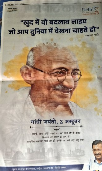 संबंधित जाहिरातीच्या व्हायरल मॉर्फ्ड फोटोमध्ये नेमकं काय होतं? जाणून घेऊया. तर, या व्हायरल फोटोमध्ये अरविंद केजरीवाल यांच्या मोठ्या फोटोसह महात्मा गांधी यांचा एक विचार छापण्यात आला होता. “तुम्हाला जगात जो बदल पाहायचा आहे तो सर्वप्रथम स्वतः आणा – महात्मा गांधी”, असं केजरीवाल यांच्या या फोटोसह छापण्यात आल्याचं दिसून आलं होता. तर फोटोच्या खाली लिहिलं होतं, “गांधी जयंती, २ ऑक्टोबर. चला, आज गांधी जयंतीच्यानिमित्त्ताने आपण गांधीजींनी घालून दिलेल्या तत्त्वांचं पालन करण्याची प्रतिज्ञा घेऊया. राष्ट्रपिता महात्मा गांधी यांना जयंतीनिमित्त विनम्र अभिवाद.”