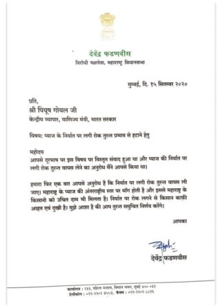 पियूष गोयल यांना पाठवलेल्या पत्रात फडणवीस म्हणतात, ”आपल्याशी फोनवर याविषयी विस्तृत चर्चा झाली होती आणि कांदा निर्यातीवर बंदी उठवण्याची विनंती मी आपल्याकडे केली होती.आमची पुन्हा एकदा आपल्याकडे मागणी आहे की, कांदा निर्यातीवर घातलेली बंदी परत घेतली जावी. महाराष्ट्राच्या कांद्याला आंतरराष्ट्रीयस्तरावर मागणी असते. यामुळे महाराष्ट्रातील शेतकऱ्यांना योग्य मोबदला देखील मिळतो. कांदा निर्यातीवर बंदी घालण्यात आल्याने शेतकरी अतिशय दुःखी आहेत. मला आशा आहे की तुम्ही तात्काळ योग्य तो निर्णय घ्याल.”