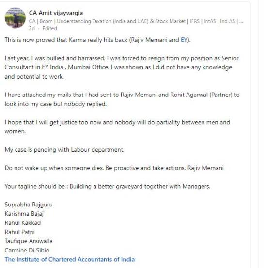 “गेल्या वर्षी मला प्रचंड त्रास दिला गेला. मला EY India, मुंबई कार्यालयातील वरिष्ठ सल्लागार म्हणून माझ्या पदाचा राजीनामा देण्यास भाग पाडण्यात आले. माझ्याकडे काम करण्याची क्षमता आणि ज्ञान नसल्याचं सांगण्यात आलं. मी राजीव मेमाणी आणि रोहित अग्रवाल (भागीदार) यांना माझ्या प्रकरणाची चौकशी करण्यासाठी मेल पाठवले होते. परंतु, त्यावर कोणीही उत्तरे दिली नाहीत”, असं अमित विजयवर्गिया यांनी म्हटलंय.
