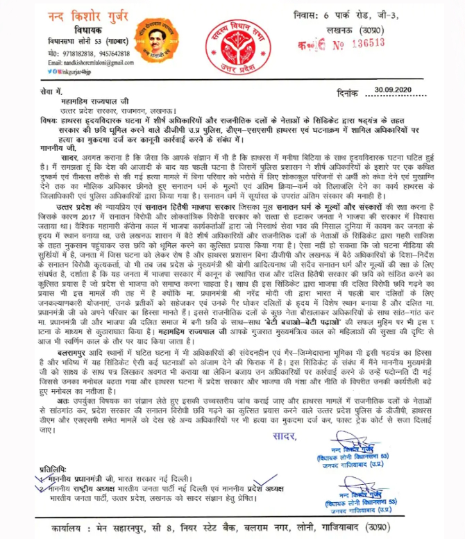 उत्तर प्रदेशमधील गाझियाबादमधील लोनी विधानसभा मतदारसंघाचे भाजपाचे आमदार नंद किशोर गुर्जर हे पुन्हा एखदा चर्चेत आले आहेत. हाथरस प्रकरणामध्ये एकीकडे उत्तर प्रदेशमधील योगी सरकारवर चहुबाजूंनी टीका होत अशतानाच दुसरीकडे भाजपाच्या आमदारानेच या प्रकरणामध्ये विरोधी भूमिका घेत थेट राज्यपालांना पत्र लिहिलं आहे. हाथरस येथे झालेल्या घटनेसाठी उत्तर प्रदेशचे पोलीस महासंचालक, हाथरसचे जिल्हाधिकारी आणि वरिष्ठ पोलीस अधिक्षकांविरोधात कलम ३०२ अंतर्गत गुन्हा दाखल करण्याची मागणी नंद किशोर गुर्जर यांनी या पत्रामधून केली आहे. नंद किशोर गुर्जर यांनी मुख्यमंत्री योगी आदित्यानाथ यांना पत्र न लिहिता थेट राज्यपाल आनंदीबेन पटेल यांना पत्र लिहिलं आहे. या पत्राची एक प्रत पंतप्रधान नरेंद्र मोदी, भाजपाध्यक्ष जे.पी. नड्डा आणि उत्तर प्रदेशचे भाजपाध्यक्ष स्वतंत्र देव सिंह यांना पाठवली आहे.