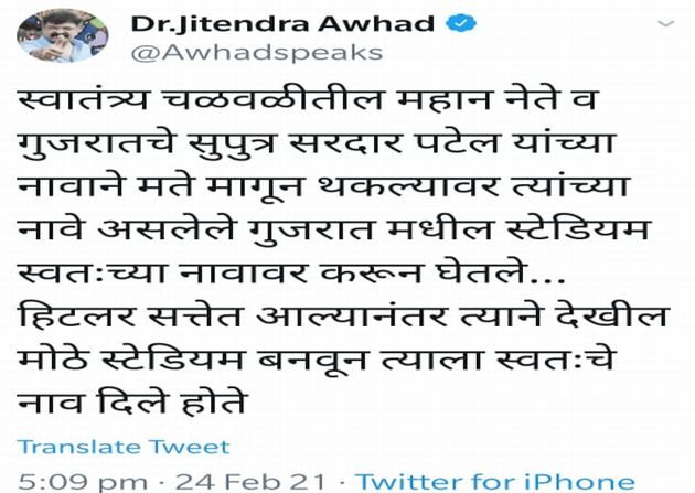 “स्वातंत्र्य चळवळीतील महान नेते व गुजरातचे सुपुत्र सरदार पटेल यांच्या नावाने मते मागून थकल्यावर त्यांच्या नावे असलेले गुजरातमधील स्टेडियम स्वतःच्या नावावर करून घेतले…हिटलर सत्तेत आल्यानंतर त्याने देखील मोठे स्टेडियम बनवून त्याला स्वतःचे नाव दिले होते”, असं ट्विट करत आव्हाड यांनी मोदींचं नाव न घेता त्यांची हिटलरसोबत तुलना केलीये.