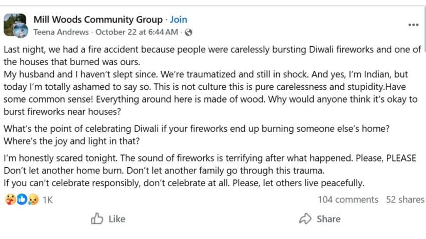 Indian Woman Ashamed After Diwali Fire In Canada: कॅनडाच्या एडमंटनमध्ये दिवाळी उत्सवादरम्यान फटाके फोडताना दोन घरांना आग लागली होती. एडमंटन पोलिसांनी आपल्या प्रसिद्धीपत्रकात म्हटले आहे की, याप्रकरणी तीन जणांवर जाळपोळ केल्याचा आरोप आहे. या आगीच्या घटनेमुळे फेसबुकवरील मिल वुड्स कम्युनिटी ग्रुपमध्ये वाद सुरू झाला असून अनेक भारतीयांनी या आगीच्या घटनेवर आपले मत व्यक्त केले आहे. यामध्ये एका भारतीय महिलेने, “मी भारतीय आहे, पण आज मला हे सांगायला लाज वाटते”, अशी प्रतिक्रिया व्यक्त केली आहे.