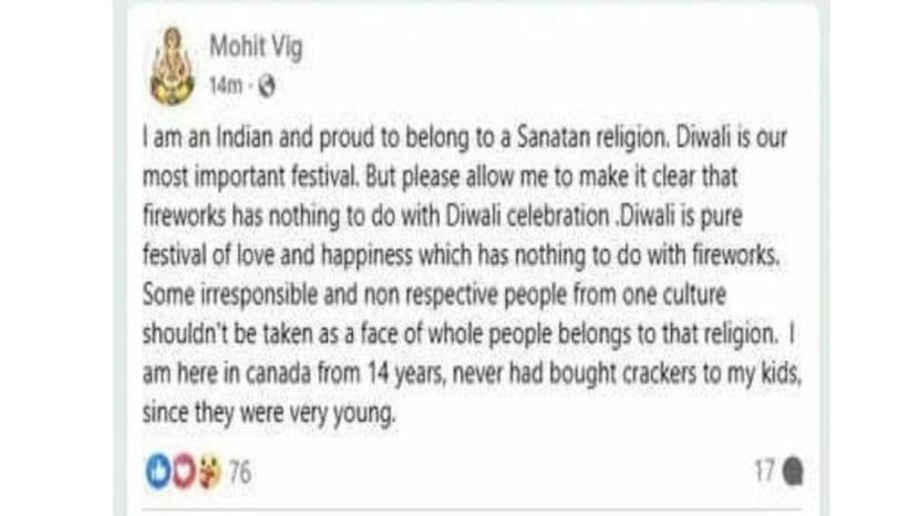 मोहित विग नावाच्या आणखी एका भारतीयाने यावर भाष्य केले आणि म्हटले की, फटाक्यांचा दिवाळी उत्सवाशी काहीही संबंध नाही. “मी एक भारतीय आहे आणि मला सनातन धर्माचा अभिमान आहे. दिवाळी हा आपला सर्वात महत्त्वाचा सण आहे. पण कृपया मला हे स्पष्ट करण्याची परवानगी द्या की फटाक्यांचा दिवाळी उत्सवाशी काहीही संबंध नाही,” असे त्यांनी म्हटले.